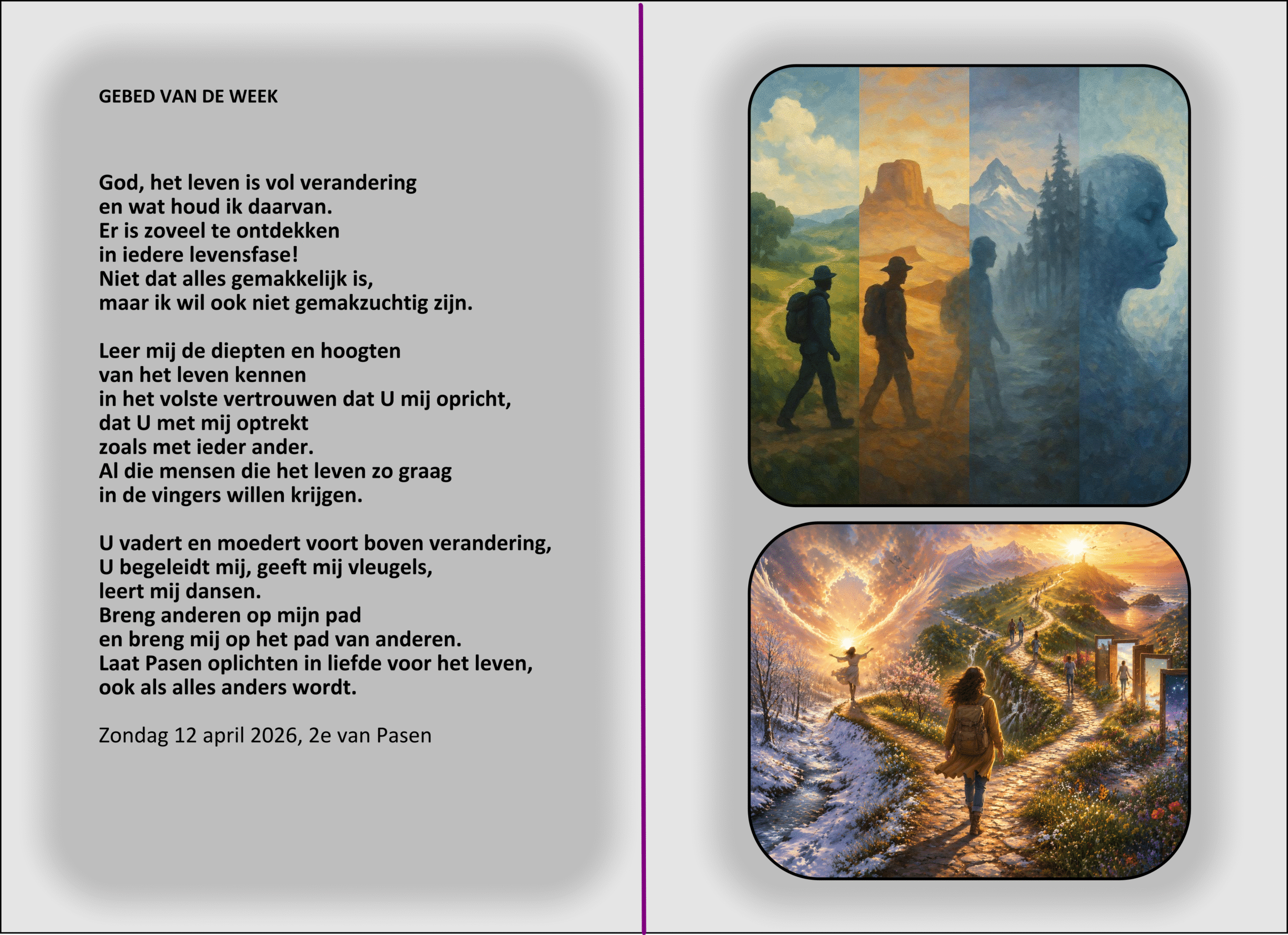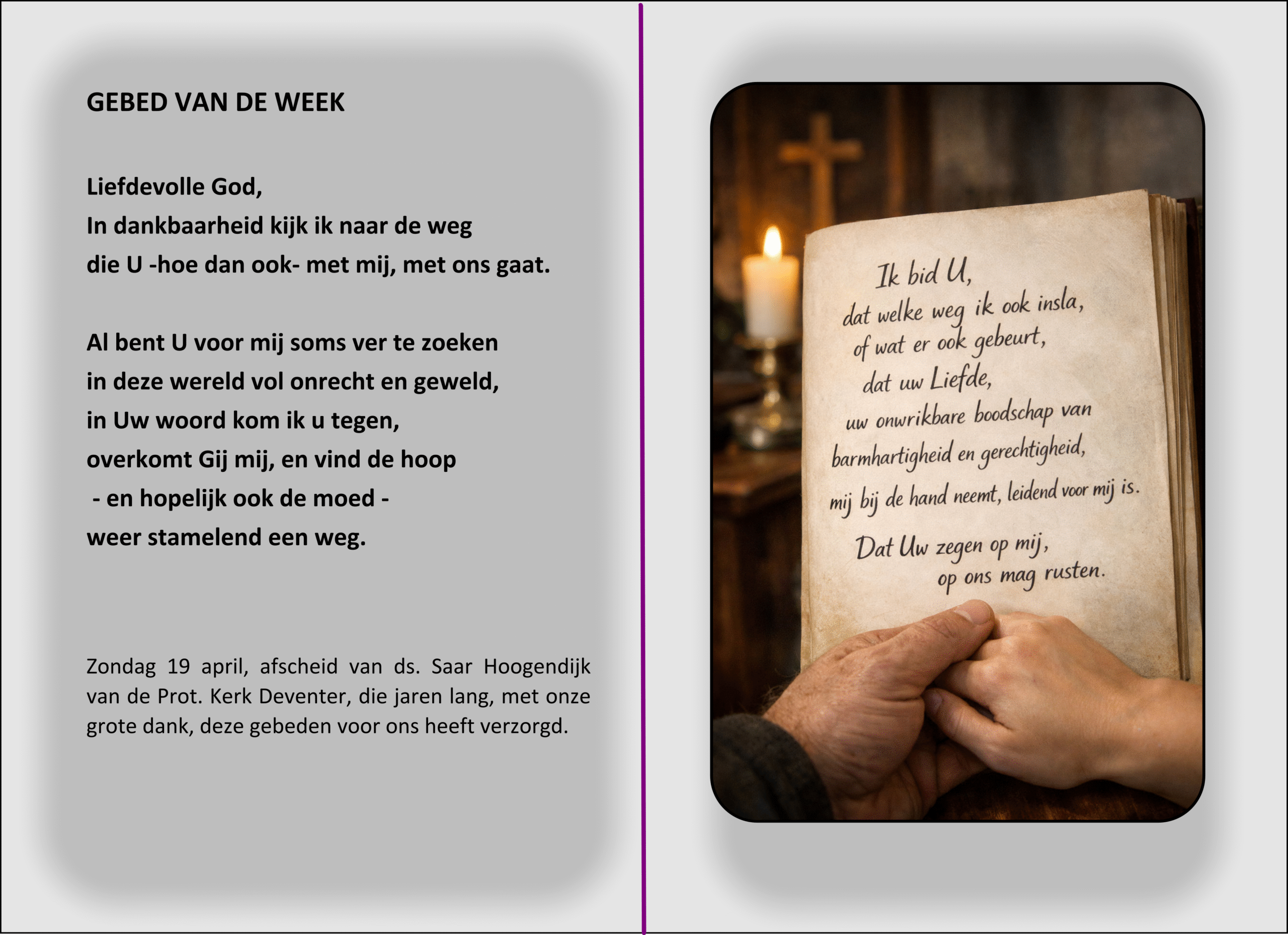 Elke week deelt de Protestantse Gemeente Enschede een Gebed van de week: een moment van bezinning, inspiratie en verbondenheid. Dit gebed helpt je om stil te staan bij God, bij jezelf en bij de mensen om je heen. Of je nu thuis bidt, onderweg of samen in de kerk, het Gebed van de week geeft woorden van geloof, hoop en liefde die je mee kunt nemen in het dagelijks leven.